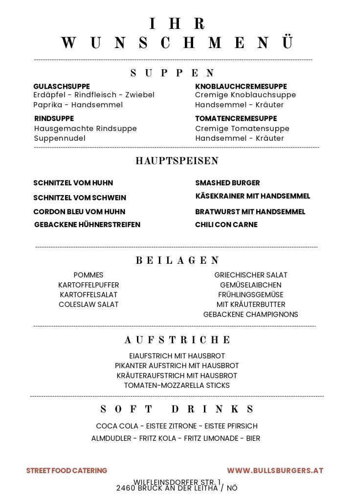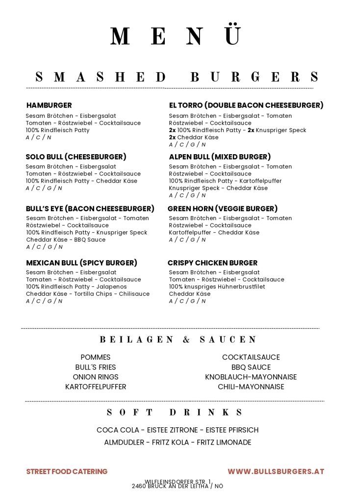 Entdecken Sie unsere BullsBurger-Klassiker aus dem Burger-Van oder unsere flexiblen Catering-Menüs für Events jeder Größe. Alle Speisekarten stehen als Bild oder PDF zum Download bereit.